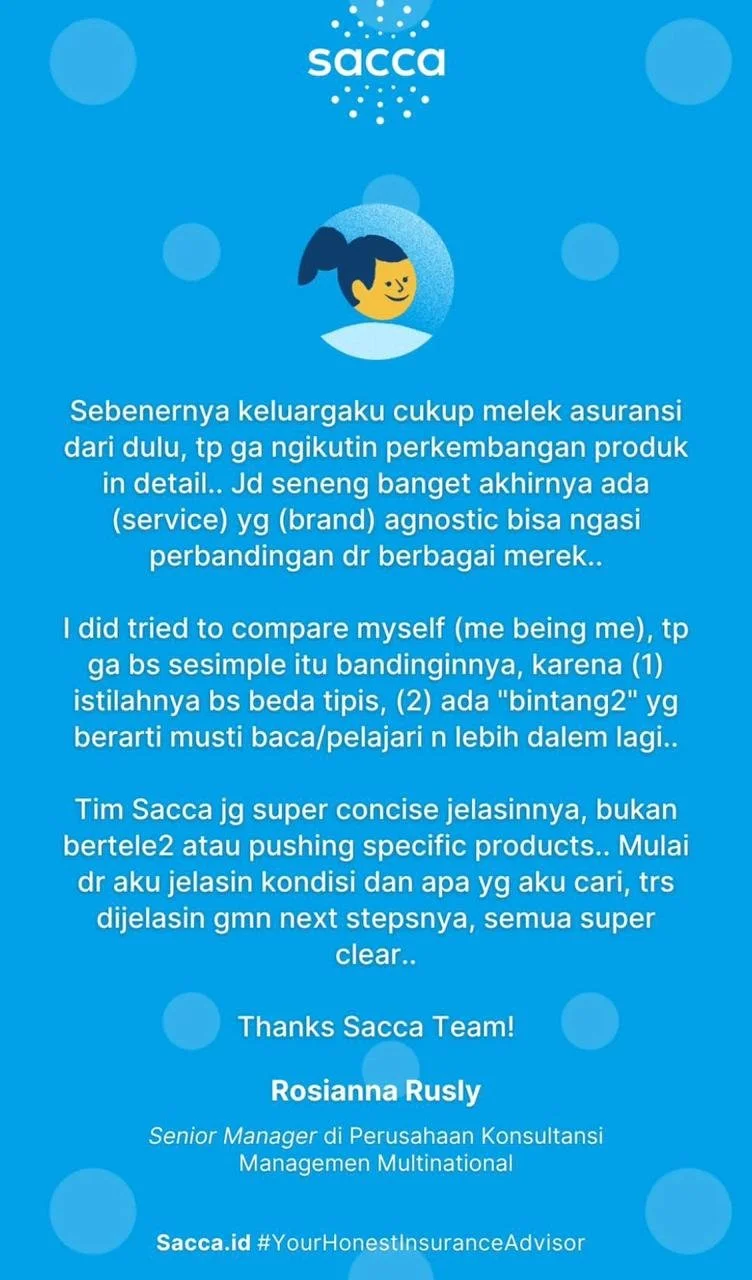 Sederhananya, Sacca membantu Anda melihat asuransi dari sudut pandang yang netral sehingga keputusan yang Anda ambil benar-benar masuk akal untuk kondisi Anda.